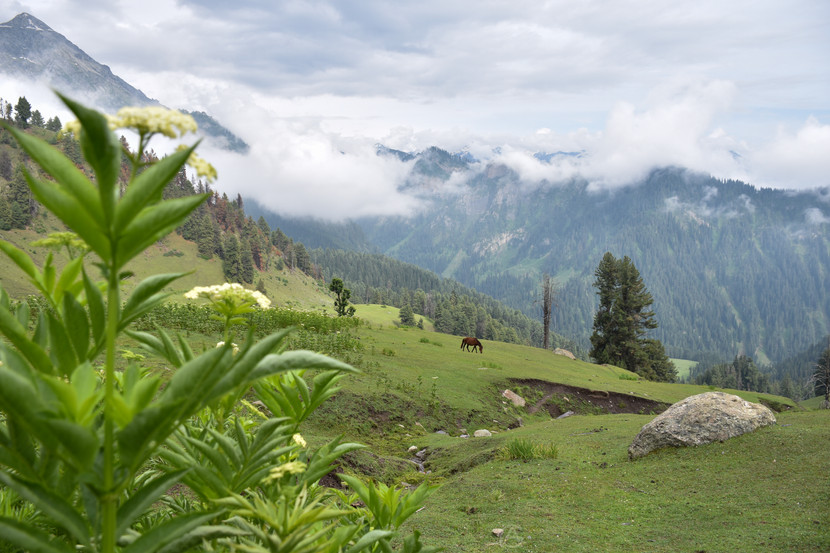 team, stuck like us who were originally headed for the Tarsar Marsar Trek. Little did we know that the Green Top was located at 10800 ft and as we started climbing, we realised that it was as good as a one day return hike. The trail was beautiful, green rolling meadows, speckled with gorgeous little flowers. Tall coniferous trees lined up in front of us and some of them sheltering Gujjar huts. The climb was quite taxing from the midway and both, the climb and the scenery just took our breathes away. We as a group climbed together, coaxing each other to keep walking. Encouraging the ones falling behind, even the ones from the other group.